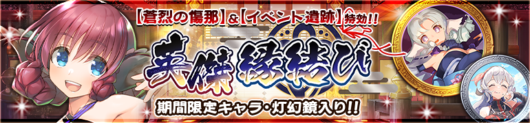 新ガチャ「【蒼烈の傷那】&【イベント遺跡】特効! 英傑 縁結び」開催のお知らせです。
