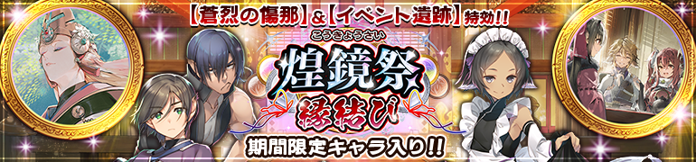 新ガチャ「【蒼烈の傷那】&【イベント遺跡】特効! 煌鏡祭 縁結び」開催のお知らせです。